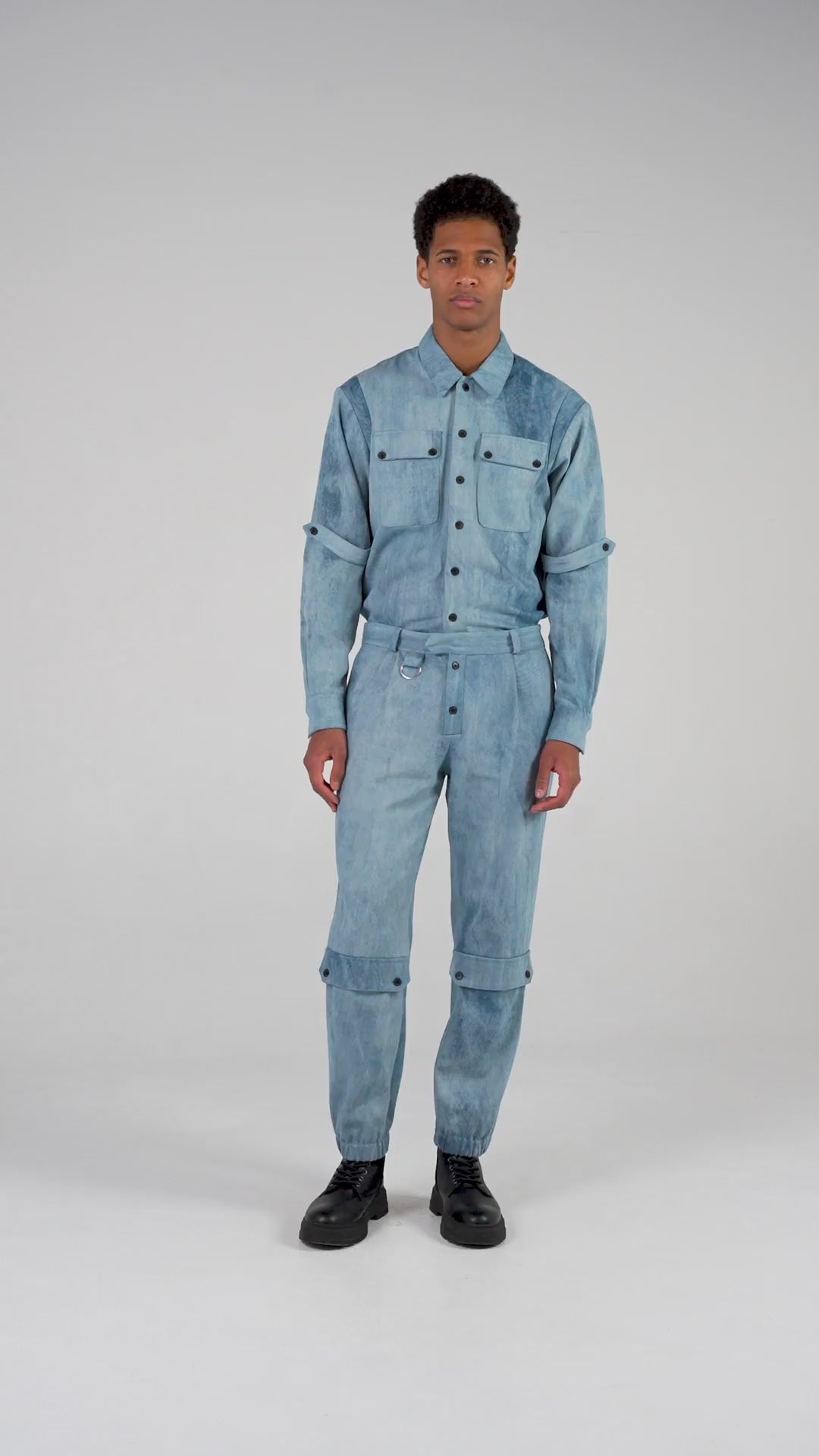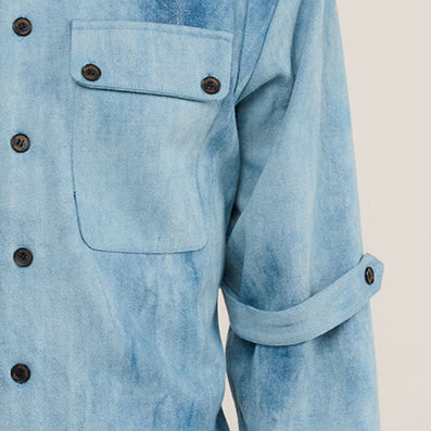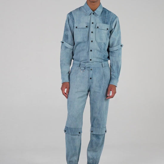 La surchemise Jaguar est fabriquée à partir d'un denim de coton bleu délavé de façon irrégulière suivant une technique exclusive rendant chaque pièce unique.